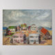Dieses Poster zeigt ein originelles Ölgemälde von Anna Unterman von einer kleinen Insel vor der Küste von New Jersey. Eine whimsikale Gruppe von Strandhäusern liegt um einen zentralen Sandhof mit einer farbenfrohen Wäscheleine, die in der Brise weht. Jedes Haus hat eine andere pastellfarbene Farbe: rosa, blau, weiß, grün und braun. Die Bucht liegt im Hintergrund mit einem Segelboot. Der Himmel ist teilweise bewölkt. Reprint mit Genehmigung des Anwesens von Anna Unterman. Alle Rechte vorbehalten.