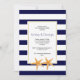 Dieses außergewöhnliche Sommerfest Hochzeit Probe Dinner Einladung zeigt ein Seesternpaar gepaart mit einem marineblau-weißen Muster. Ihr Text ist in einem weißen Rahmen mit goldener Kontur. Die Rückseite weist ein marineblau-weiß gestreiftes Muster auf.