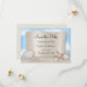 Elegant speichern Sie die Ankündigungen für eine Hochzeit zum Thema Strand mit Muscheln, Sand Dollars, einem Seestern und einer Nachricht über einem blauen Himmel.