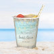Diese rustikalen Becher aus Brautparty an der Küste bieten eine Szene von Wassergymnastikwellen, die gegen den Strand abstürzen, mit einem Rahmen aus verwittertem Holz, und Saitenleuchten, die den Gipfel betonen. Karo aus der Kollektion für passende Papierserien und -servietten, Teller und andere Tischdekorationen.