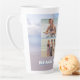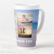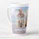 Hohe Latte-Tasse mit Strandmotiv-Hintergrund. Anpassen mit vier Fotovorlagen und Text entlang der Unterseite. Ein ruhiges, blaues Meer und glatter Strand sind der Hintergrund für das Teilen von lustigen Fotos von den Kindern, Urlaub, Haustieren und Familienzeit.