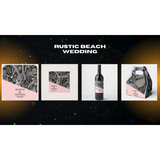 Wenn Sie Hilfe bei der Anpassung dieses Designs benötigen, nutzen Sie bitte den frag dieses Designers-Buttons unterhalb dieses Textes. Eine Hochzeitseinladung für einen Strand der Hochzeit. Ein rosa Banner und ein Foto aus Strandsteinen, Kies und Treibholz.
