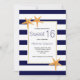 Starfish und marineblaue weiße Streifen Strand 16 . Geburtstag Geburtstag Einladung. Die Elemente dieser Einladung sind das marineblau-weiß gestreifte Muster und der Sternfisch an den Ecken eines weißen Rahmens mit Ihrem Text.