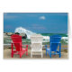 Rote, weiße und blaue Adirondack-Stühle am Strand mit abstürzenden Wellen auf Felsen.
