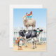 Ente, Kuh, Schafe und Hen am Strand senden Grüße für den Urlaub. humorvoll