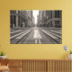 Ein sepiatfarbenes Foto erfasst einen Blick auf die Straße in San Francisco. Der Ausblick ist auf Straßenbahnlinien ausgerichtet, die in der Mitte der Straße entlang führen und zu weit entfernten Gebäude führen. Im Vordergrund sind Kreuzgänge sichtbar. Große Gebäude reihen sich beiderseits der Straße ab und schaffen einen Canyon-ähnlichen Effekt. Das Bild ruft ein Gefühl urbaner Stille und klassischer Stadtarchitektur hervor.