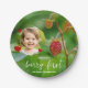 Celebrate in sweet, natural style with this paper plate design featuring a photo by Destei of a red wild strawberry among green leaves. Next to the berry, there’s a space to add your child’s photo, surrounded by three red hearts that complement the theme. The text is personalizable to include your child’s name, reading “[Name]’s berry first birthday celebration.” A fresh and heartfelt addition to any berry-themed first birthday or garden party.