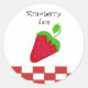 Ein großartiges Label, um Ihren hausgemachten Erdbeermarmeladen zu ergänzen. Eine üppige rote Erdbeere mit einem leuchtend grünen Stamm. Ein Rand mit roten und weißen quadratischen Mustern unten.