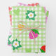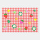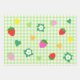 Dieses niedliche und farbenfrohe Verpackungspapier enthält Erdbeeren in Rot und Rosa, weiße Erdbeeren-Blume, dunkelgrüne Blätter und farbenfrohe Lieben in Rot, Rosa, Grün und Gelb. Der Hintergrund ist ein hellgrünes, rosa und rotes Gingham-Muster.