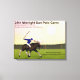 Ein Polospieler, der einen Elch (Alces alces) reitet, der zum Streik aufgewachsen ist. Die Sonne hängt tief über dem umliegenden Nadelwald. Es erscheint auch Text-Lektüre "25 Mitternacht Sun Polo Game", "Sponsored by the North Star Polo Club", "Sunday at the Fairbanks Polo Grounds" und "Begins prompt um Mitternacht Moskitos und Sorten unter acht gratis erhalten". Jedes Jahr spielt Alaska, das Baseballteam von Goldpanners von Fairbanks, im Baseballspiel der Mitternacht. Das Spiel beginnt um Mitternacht auf der Sommersonne, nur von der Sonne beleuchtet. Fairbanks ist nur 260 Meilen südlich des Polarkreises, die Sonne fängt gerade an, im Norden zu Set, während das Spiel beginnt, und nach drei Stunden später beginnt die Sonne wieder zu steigen - auch im Norden. Baseball ist nicht der einzige Sport, der auf der Sonnenseite gespielt werden könnte. Und die Idee, einen Elch zu fahren, ist nicht neu. In Nordeuropa und Asien wurden Elche benutzt, um Fahrer und Ladungen über unwirtliches Gelände zu transportieren. Der Elch überquert als Berg Moore und Wind, schleicht sich durch Dicken, klettert über Felsen und schwimmt schnell über weite, gefährliche Flüsse. In den dichten Nadelwäldern und Mooren, die weite Teile Nordeuropas und Asiens bedecken, kann ein Reiter auf dem Pferd einem Elch nicht voraus sein - wie der russische General Yermak Timofeyich herausfand, als er im sechzehnten Jahrhundert die Eroberung Sibiriens im Namen des Zaren Iwan der Schrecklichen begann. Um die sibirischen Elchreiter mit der Oberhand zu gewinnen, untersagte General Timofeitsch die Elchzucht, tötete von gezähmten Elchen ab und jagte systematisch Elendsreiter, um sie als Beispiele für andere öffentlich zu töten, zu inhaftieren oder zu verstümmeln. Es ist wahrscheinlich, dass die Elchzucht in den nördlichen Wäldern nur häufig genug war, um eine Belästigung zu sein, denn wie wir heute wissen, sind Elch für all ihre Vorteile als Lasttiere schwer in Gefangenschaft behalten. Hätte man den Elch geübt, wären die harten, abenteuerlichen Cossacks sicher die Reittiere gewechselt und hätten die Elchreiter zu gleichen Bedingungen verfolgt. In Europa wurden Elche auch benutzt, um Schlitten über große Entfernungen durch gefrorene Abfälle zu ziehen. Ein Nachteil bei der Verwendung von Elch auf diese Weise ist, dass Pferde, die nicht mit Elch vertraut sind, wild und unkontrollierbar werden, wenn sie mit diesen seltsam aussehenden Kreaturen konfrontiert werden. Im siebzehnten Jahrhundert verbietet der Stadtrat der estnischen Stadt Dorpat (Tartu) domestizierte Elche auf seinen Straßen. Man kann sich nur vorstellen, was verheerende Pferde aus der Kontrolle, die an einen Trainer oder Wagen geknallt wurden, in den engen Gassen der Stadt wüten könnten, nachdem sie plötzlich von Angesicht zu Angesicht von einem Elch getroffen wurden, der unschuldig einen Schlitten in die Stadt zog. König Karl XI von Schweden überlegte, ein Kavallerieregime auf Elche zu gründen, wahrscheinlich um den Terror auszunutzen, den sie in die Herzen feindlicher Pferde schlagen würden. Kein Kanon und kein Feuer mit Muskeln, keine Lanzen und Säbel wären nötig, um die Kavallerieangriffe des Feindes zu zerstreuen. Allein das Erscheinen eines Elchs auf dem Schlachtfeld würde die Kavallerie des Feindes in einen unbeachtlichen Flug bringen. Leider wurde der große Plan des Königs aufgegeben, und Experimente zur Domestizierung des Elchs in diesem Jahrhundert machen deutlich, warum. Elch konnte nie gedeihen, als sich die Kavallerie aufgrund ihrer katastrophalen Anfälligkeit für Viehkrankheiten und der großen Schwierigkeiten, den Elch richtig füttern, anhäuft. Bereits 1869 schrieb der russische Zoologe und Forscher Alexander von Middendorff an die zarische Regierung: "Selbst das zivilisierte Europa hat heutzutage versagt, den Elch zu domestizieren, das Tier, das zweifellos von großem Nutzen sein kann. Unsere Regierung sollte alle erdenklichen Anstrengungen zur Domestizierung dieses Tieres unternehmen. Das ist machbar. Die Belohnung wäre großartig, und auch der Ruhm." Nach dem 17. Jahrhundert wurde die Elchzucht fast vierhundert Jahre lang zu einer vergessenen Kunst. In Schweden fand im späten 18. Jahrhundert eine Debatte über den nationalen Wert der Verwendung des Elchs als Haustier statt. Unter anderem wurde vorgeschlagen, den Elch in der Postzustellung zu verwenden, und es gab einen Vorschlag, eine am Elch angebrachte Kavallerie zu entwickeln. Solche Vorschläge blieben unumgesetzt, vor allem, weil die extensive Jagd auf Elche sie beinahe zum Aussterben brachte und weil sie während der Rutperiode aggressiv waren. Die Idee der Elchdomestizierung kam im zaristischen Russland nicht sonderlich gut an. In der sowjetischen Gewerkschaft der 1930er Jahre tauchte sie jedoch wieder auf; damals wurde behauptet, die Elchskavallerie könne auch im Tiefschnee effizient genutzt werden. Im Jahr 1934 ordnete das Naturschutzkomitee der Sowjetregierung die Bildung von Elchreservaten (Zapovedniks) und Elchzuchtzentren an. Die experimentelle Arbeit, die von Petr Alexandrowitsch Manteufel initiiert wurde, fand an mehreren Orten statt: in Jakutia, auf der Versuchsspielfarm Serpukhov und im Naturschutzgebiet Buzuluksy Bor in der Region Orenburg. Russische Wissenschaftler befassten sich systematisch mit dem Problem der Elchzucht und waren erfolgreich. Sie entdeckten, dass Elche ausgebildet werden konnte, Milch zu geben, Lasten oder Fahrer zu tragen, Schlitten und Stangen zu ziehen, auf Weide zu gehen und freiwillig zu Stallungen zurückzukehren. Die Arbeit war jedoch nicht rechtzeitig zum Zweiten Weltkrieg beendet, und als der Krieg kam, wurde die ganze Idee der Kavallerie als Kampftruppe weggefegt. Nach dem Krieg wurde die Idee, den Elch zu domestizieren, wieder verfolgt, wobei der Schwerpunkt auf der landwirtschaftlichen Nutzung lag. Es wurde angenommen, dass der Elch, dessen Name in einer algonquianischen Sprache Zwielicht bedeutet, eine idea