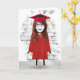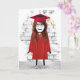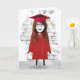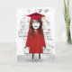 Niedliches Peitschmädchen mit langen Haaren, Abschluss Diplom, Sneakers, rote Kappe und Gown für Graduate Gratulationen.