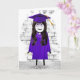 Niedliches Strichmädchen mit langen dunklen Haaren, Abschluss-Diplom, lila Brille, Sneakers, lila Kappe und Gown für Graduate Gratulationen.