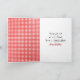 Niedliches Strichmännchen mit kinkigem Haar, Sneakers, Gingham Kleid, Perlenhalskette und zartes Bouquet auf rotem und weißem Gingham Hintergrund. Inside text kann geändert werden.