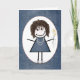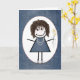 Niedliches Strichmännchen-Mädchen mit knackigen Haaren, Sneakers, blaues Denim-Kleid, Perlenhalskette und zartes Bouquet auf blauem Denim-Hintergrund.
