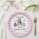 Ein Strichmännchenmädchen-Violinenspieler in einem rosa Kleid auf rosa Zickzack Entwurfspapier-Teller.