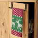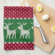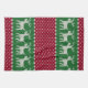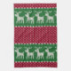 Es ist ein gewebter Pullover-Look - in einem Druck! Ein reich detailliertes Muster mit weißen Rentieren, die über ein grünes Feld ragen, umgeben von einem Weihnachtsrot mit weißen Verzierungen.