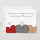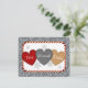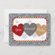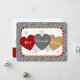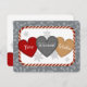 Rote, graue und bräunliche Garnherzen mit Pullover-Textur, Zuckerrohrrahmen und Hintergrund auf dieser Weihnachtskarte für Stricker oder für die Gabe Ihrer Liste mit handgemachten Strick- und Häkelprojekten.