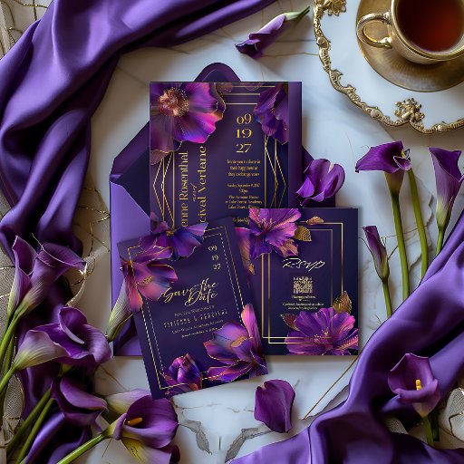Luminous Violets Save the Date Card | Elegant Purple & Gold Floral Wedding Announcement | Editable Luxury Save the Date Invitation | Modern Romantic Wedding Stationery
