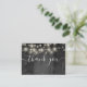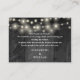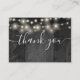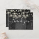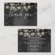 Eine elegante Saite beleuchtet rustikale Stallenhochzeit aus schwarzem Holz danke Ihnen Empfang-Karte, personalisiert mit einer besonderen Nachricht und den Namen der Braut und Bräutigam. Entwickelt von Thisisnotme©