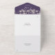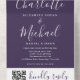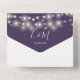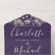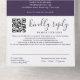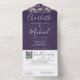 Alles in einer Hochzeitseinladung mit hübschen Saitenlichtern und eleganten Signatur-Script-Namen und Monogramm-Initialen auf lila Hintergrund. Die Einladung enthält eine perforierte RSVP-Karte mit Ihrem Hochzeitswebseiten QR Code und Details. Entwickelt von Thisisnotme©