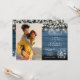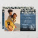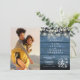Eine stilvolle Hochzeitseinladung mit Ihrem besonderen Foto und hübschen Salbei- und Lila-Blätter, Saitenleuchten, Mason-Gläsern und Ihrem Hochzeitsdetails-Set in elegantem Text auf blauem rustikalem Holzhintergrund. Entwickelt von Thisisnotme©