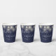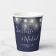 Eleganter marineblauer Hochzeitspapier-Becher mit hübschen Saitenleuchten, Signaturstilnamen und Ihrem besonderen Hochzeitstag. Entwickelt von Thisisnotme©