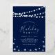 Feiern Sie die Saison mit dieser modernen Fotoleiterparty. Dieses Design besticht durch stilvolle Saitenleuchten, Schneeflocken und die Typografie "Holiday PARTY" auf marinebasischem Hintergrund. Sie können alle Text-, Folien- und Hintergrundfarbe anpassen. Ein tolles Design für ein stilvolles, modernes Weihnachtsabendessen-Party oder eine Firmenfeier.