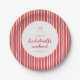 Striped Coquette Bow Bachelorette Weekend Paper Plates. Designed with a red and white striped pattern, bow, and script lettering, personalize these bachelorette paper plates with the bride's name, and wedding or bach weekend location below.