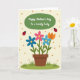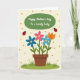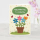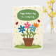 Designed with a sweet garden scene, this card centers on an earthy brown flowerpot holding a cheerful cluster of stylized blooms that lean toward each other like close friends ❤️. The petals mix bright pink, two shades of light blue, and one warm orange flower, all held up by slim green stems and simple leaf shapes. Above the flowers, a green oval banner sits near the top, carrying a short message in white lettering. The creamy background is sprinkled with muted orange polka dots that feel like soft confetti floating around the bouquet 🌼. On either side of the pot, two red winged insects with dark spots hover as if circling the flowers together. Along the bottom edge, a strip of green ground with little grass tufts frames the scene. The banner’s green oval has a smooth outline, and the white text is centered inside it near the upper third of the design.
