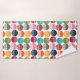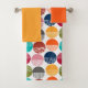 This towel set has an orange washcloth, a gold hand towel, and a bath towel with a mid-century modern design of striped semicircles and solid semicircles put together on a field of white.