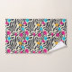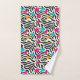 Cette serviette de bain vibrante est une fusion dynamique de rayures en noir et blanc, comme des zèbres, superposées avec des éclaboussures de peinture colorées aux formes de feuilles d'automne. Le contraste saisissant entre l'arrière - plan monochrome et les tons vifs de rouge, d'orange et de jaune crée un motif captivant visuellement. Idéal pour diverses applications créatives, ce design réunit l'essence sauvage des posters de animaux avec les tons chauds du feuillage d'automne.