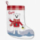 Ein rotes und weißes WeihnachtsStrumpf mit einem polaren Bären des Cartoon, der ein Licht in einer Hand hält und mit der anderen wellenartig bewegt. Sie hat auch ein trompe - L ' oeil karierte Grenze. Personifizieren Sie sie mit einem Namen.