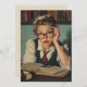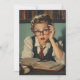 Eine junge Frau in Vintager Kleidung, die eine Brille trägt, sieht überwältigt aus, während sie an einem Schreibtisch mit offenen Büchern studiert. Die Umgebung ähnelt einer akademischen Szene aus den 50er Jahren.