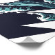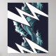 Ein kühn grafisches Design mit kräftigen Ozeanwellen in aquamarinen, türkisfarbenen und tiefblauen Farbtönen, kontrastiert mit scharfen, weißen Blitzen, die über einen dunklen Marinehintergrund schneiden. Die dynamische Komposition verbindet die Strömungsbewegung abstürzender Wellen mit der gezackten Blitzintensität und schafft ein dramatisches und energetisches visuelle, das die Rohkraft der Natur erobert.