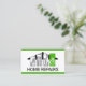 Cover verfügt über ein kreatives Gebäude auf dem Dach, das handwerkliche Bauwerkzeuge enthält. Die Säule des grünen Gebäude wird durch grüne Streifen am oberen und unteren Rand der Karte verstärkt. Jedes Werkzeug stellt einen Teil des Service dar, den Sie anbieten können, z.B. das Hammermessband kann Umbauarbeiten darstellen, die Rollbürstenleiter für die Malerei, der Wassertropfschlüssel für die Klempnerarbeiten und die Glühbirne für den elektrischen Dienst. Unter all diesen steht der Firmenname "ZUHAUSE REPAIRS", den Sie ändern können. Hinter einem weißen Cover befindet sich oben das farbenprächtige Zuhause-Hammer-Logo, das Sie verwenden können. Danach folgen Ihr Name, Ihre Kontaktdaten und ein Slogan, um Ihre Dienste bekannt zu machen. Eine großartige Kreativkarte für Handwerker, Bauunternehmen. #handyman #constuctionhandyman #homerepairtraiter #construction #builder #remodeling #handymantools #buildingtragnehmer #homerepair #interiordesign#roofing #roofer #roofingtragnehmer #zazzlemade