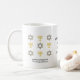 Stilvolle HAPPY HANUKKAH Kaffee Tasse, die Imitate Gold und Silber STAR OF DAVID und MENORAH in einem gefliesten Muster vor einem schlichten weißen Hintergrund. Text liest HAPPY HANUKKAH mit einem Platzhalter und ist KUNSTBAR, sodass Sie ihn PERSONALISIEREN können, indem Sie Ihren Namen oder einen anderen Text hinzufügen. Das Design wird auf der Rückseite wiederholt, und in der Mitte befindet sich der CUSTOMIZABLE Beispieltext, in dem Sie Ihre Nachricht oder Ihren Gruß personalisieren können. Ideal für hanukkah Feiern, und mit der Anpassung kann für jeden jüdischen Anlass geeignet sein. Wählen Sie aus einer großen Auswahl an Dosenkühlern von Berean Designs. Auch verfügbar in Mitternachtsblau.