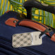 Travel with sophistication and ease with this boutique-style luggage tag. Featuring a timeless beige and black plaid pattern on the lower half and a sleek, solid sand-toned top, this design is punctuated by a striking metallic silver divider for a touch of modern luxury. This tag is as practical as it is stylish, making it easy to spot your bags on a busy carousel while maintaining a polished look. The front features a customizable name template (shown as "Melissa") in a sharp, modern serif font, allowing you to personalize it for yourself or as a thoughtful gift for the frequent traveler in your life. The back includes clear, pre-printed lines for your essential contact information, including name, address, and phone number. Perfect for suitcases, carry-ons, or even a professional laptop bag.