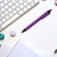 Stylo en plastique cool et tendance qui présente une image d'une petite fleur de géranium Cranesbill violet sur un arrière - plan et imprimé dans un motif extensible. Sélectionnez votre couleur d'encre et la couleur de garniture.