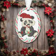 C'est un joli ornement de Noël pour tout enfant qui aime les ours de panda. Un panda noir et blanc aux yeux larges tient un sucre de canne et porte un chapeau de Père Noël. En dessous de l'image est le nom de votre enfant spécial en vert. L'image est encadrée d'un joli motif rayé rouge, vert et blanc sucre de canne. L'arrière de l'ornement a le même cadre rayé, et plus de champs de texte pour vous de customiser. Cette conception fonctionne bien pour un garçon ou une fille, et peut être pour un fils, une fille, un petit-enfant ou n'importe quel enfant!