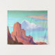 Tapestry in einer boho / minimalistischen Stil Illustration einer südwestlichen Wüstenlandschaft von Terrakotta Berggipfeln mit einem aquaischen Himmel