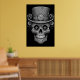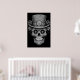 Sugar Skull images, black and white, in a cool top hat, on a wall poster.