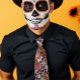 Lächelnde Dia de los Muertos - Tag des Toten oder Halloween-Design mit Schädel und Blume.
