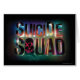 Technicolor 3D Suicide Squad Logo mit einem Schädel im Buchstaben Q. Farbige Buchstaben auf schwarzem Hintergrund.