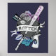 Karo aus diesem Herz Tattoo inspiriert Grafik für Harley Quinn, mit dem Wort "Rotten" geschrieben über einem Banner über einem Herz mit einem Kuss-Druck. Neben dem Herzen sind Rose und Harleys Waffen: eine Waffe und ihre Gute Nacht Fledermaus.
