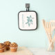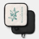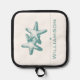 Dieser Potholder weist ein sommerliches Design überlappender Seesterne über einer Trennlinie mit einer Sternexplosion und einem personalisierten Namen unten auf, alles aquamarin auf Weiß.