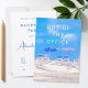 Beach scene illustration with blue skies, sandy shores, and relaxing beach chairs - perfect for retirement party celebrations. Inspired by a Mediterranean beach photo, this painterly design captures the relaxed coastal lifestyle of retirement. Ideal for honoring someone's transition to a life of leisure and beach living. Fully customizable with names, party dates, venue details, and personal text. Great for beach-themed retirement celebrations and seaside party invitations.