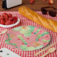 Niedliche gemusterte Kaktus Grafik von Valarie Wade. Einfaches und sauberes Design. Ich würde gut funktionieren für Cactus Geburtstage, Babyduschen, Hochzeiten, Brautpartys, Grillen, Bankette, Kochgelegenheiten, etc. Roter Hintergrund