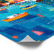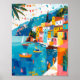 Whimsical abstract representation of a lively Mediterranean fishing village during a summer festival, bold geometric shapes and flowing lines.