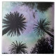 Modern dreamy summer rainbow colors holographic gradient black exotic palm trees cloudy photo, filled with summer vibrant colors, faded planets, crescent moon, shining stars, and clouds. Beautiful magical tropical design.