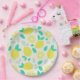 Ein trendiges Sommermuster aus hellgelben, vollen Zitronen und Zitronenschnitzeln, umgeben von aquamarinen und mintfarbenen Blätter. Dieses Zitrusfrüchtemuster eignet sich perfekt für sonnige Sommertage.